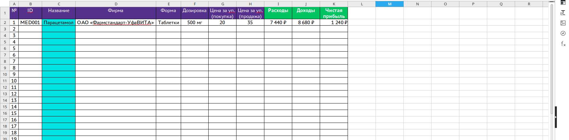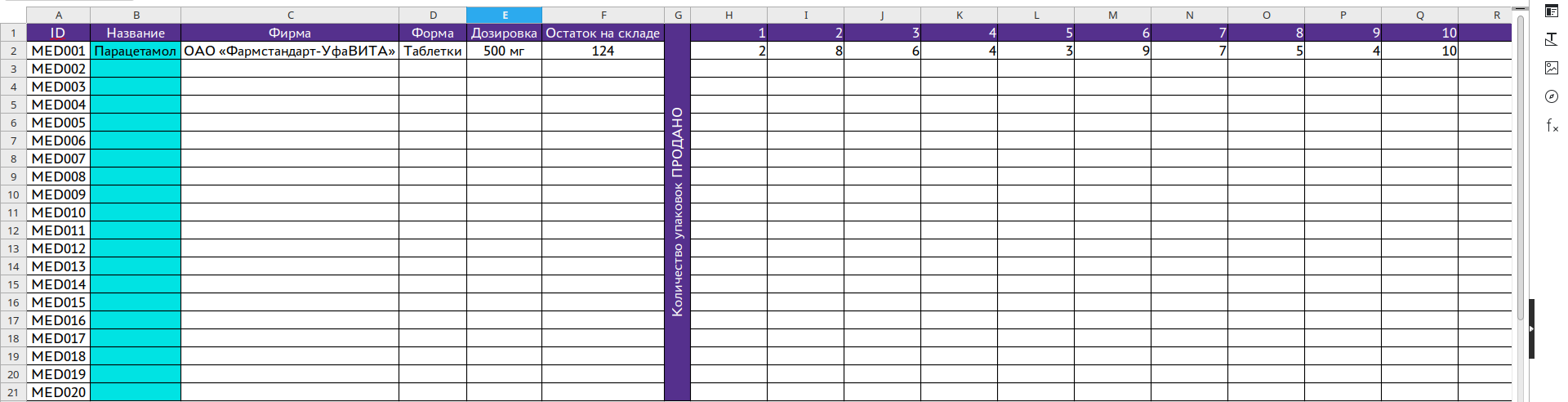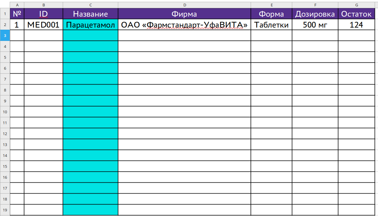 Столбцы: №, ID, Название, Фирма, Форма, Дозировка, Остаток, берутся автоматически из листа: Приход